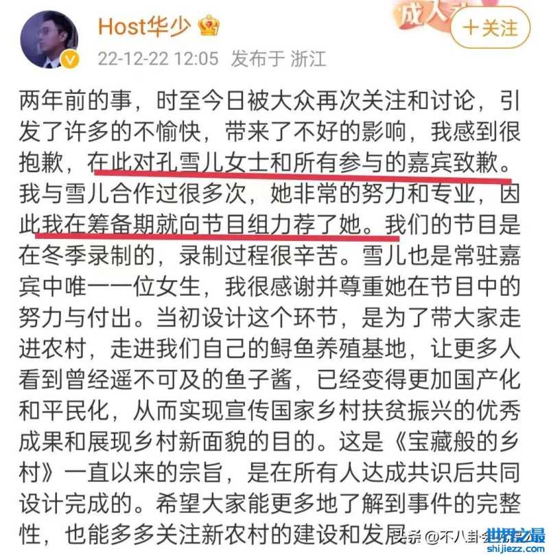 随着熊梓淇的发言,事情越闹越大,主持人华少受到的争议最多。终于,他发文道歉,并表示是他向节目组推荐的孔雪儿。此话一出,吃瓜群众觉得一言难尽,觉得华少道歉不真诚,倒有点显摆的意思。