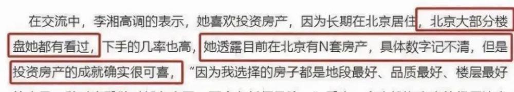 李湘很有先见之明,早早就开始投资房产。她之前就透露,因为自己常住北京,北京所有楼盘她几乎都看过,至于她自己买了多少套房子,她似乎已经忘记了,于是用了“N”来计算。