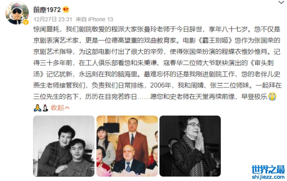 12月27日,京剧表演艺术家张曼玲老师不幸辞世,享年87岁。不少好友得知噩耗后纷纷发文悼念。