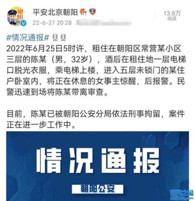 2022年6月份,陈霄华酒后擅自闯入他人住宅被抓,当时的陈霄华酒后在其租住地一层电梯口脱光衣服,闯入5层一户人家中。