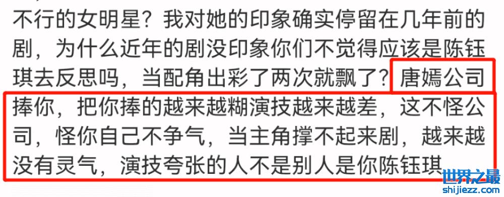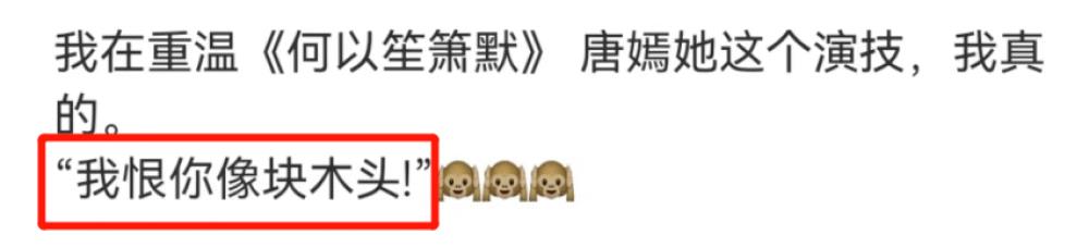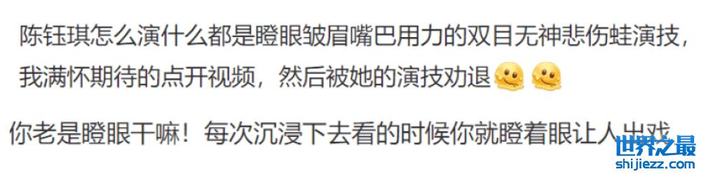 翻看6年前观众对唐嫣的演技评价,你会发现,这些话套用在陈钰琪身上,也完全适配:“脸上看不到任何情绪,一直把眼睛瞪得大大的,空洞无神的眼睛毫无灵气可言,可惜老天给她的一副好皮囊。”、“我恨你像块木头!”