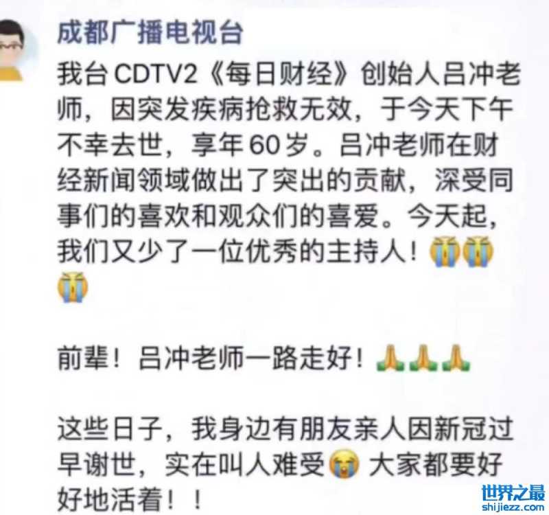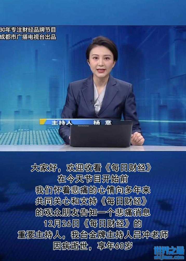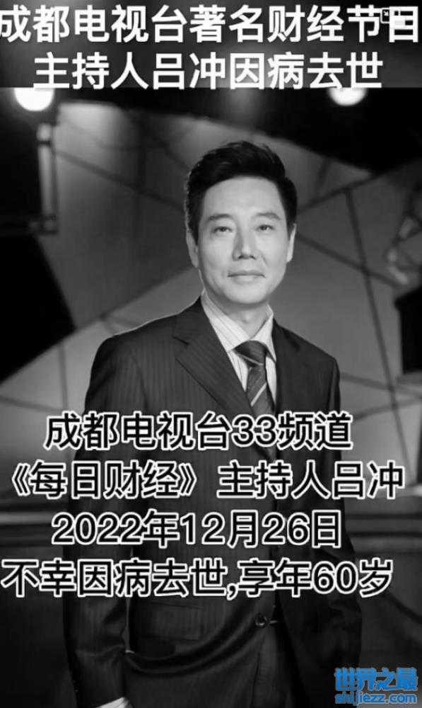 在吕冲猝然离世之后,成都广播电视台主持人杨意在当日的主持中对外发布噩耗,她直言在节目开始前,怀着悲痛的心情向多年来共同关心和支持《每日财经》的观众朋友告知一个悲痛消息,12月26日,《每日财经》的重要主持人,我台金牌主持人吕冲老师因病逝世,享年60岁。