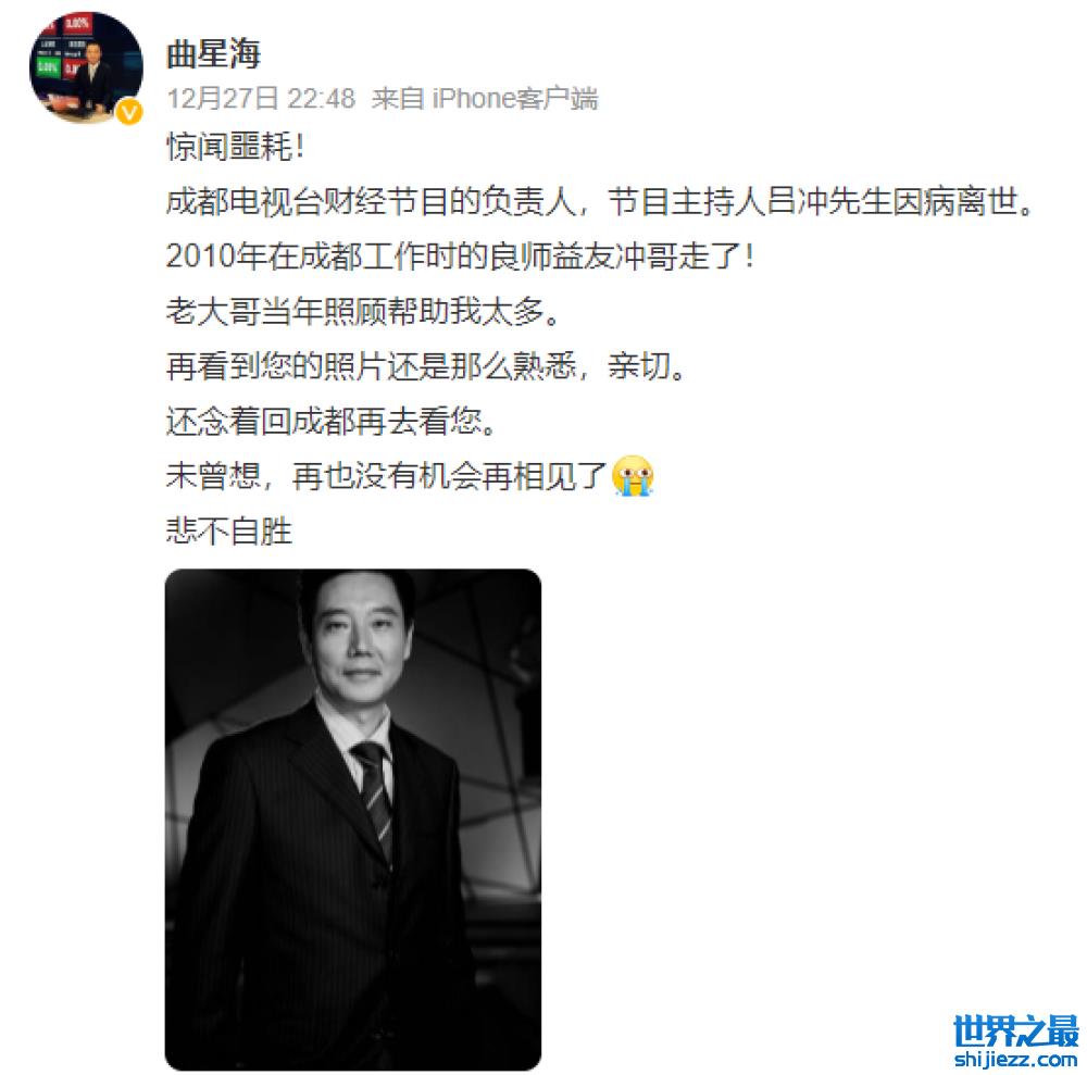 此外,吕冲生前的伙伴曲星海也发文追忆故友,其中提到自己2010年曾在成都工作,当时受到了吕冲的很多帮助,心中一直感恩在心,本想着日后有时间回成都再去拜访冲哥,没想到当初一别竟然成为永远。