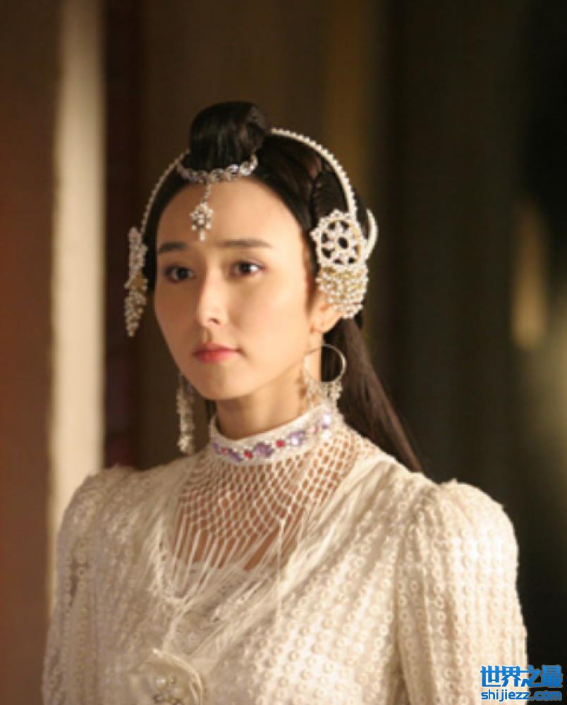 她在剧中的异域风造型,两侧有珠饰点缀,再加上独特的额饰,让整个造型加分不少。
