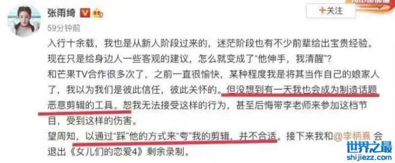 这个片段播出后,迅速引发热议。很多网友认为,李柄熹是看中了张雨绮的人脉,才跟她在一起,并不是真心喜欢她。没想到,看到男友评论区沦陷后,张雨绮发文为他抱不平,称是节目组恶意剪辑,还决定退出这档综艺。
