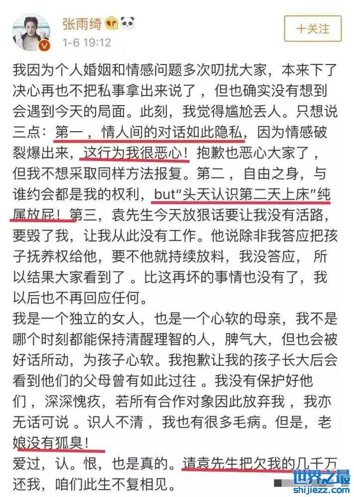 先是袁巴元发文爆料,称张雨绮经常跟人出去开房,并晒出相关聊天记录,说张雨绮不顾及小孩,还说她有狐臭。