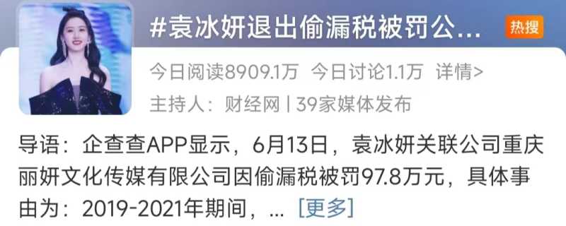 据有关媒体报道,6月13日,袁冰妍关联公司重庆丽妍文化传媒有限公司因偷漏税被罚97.8万元。