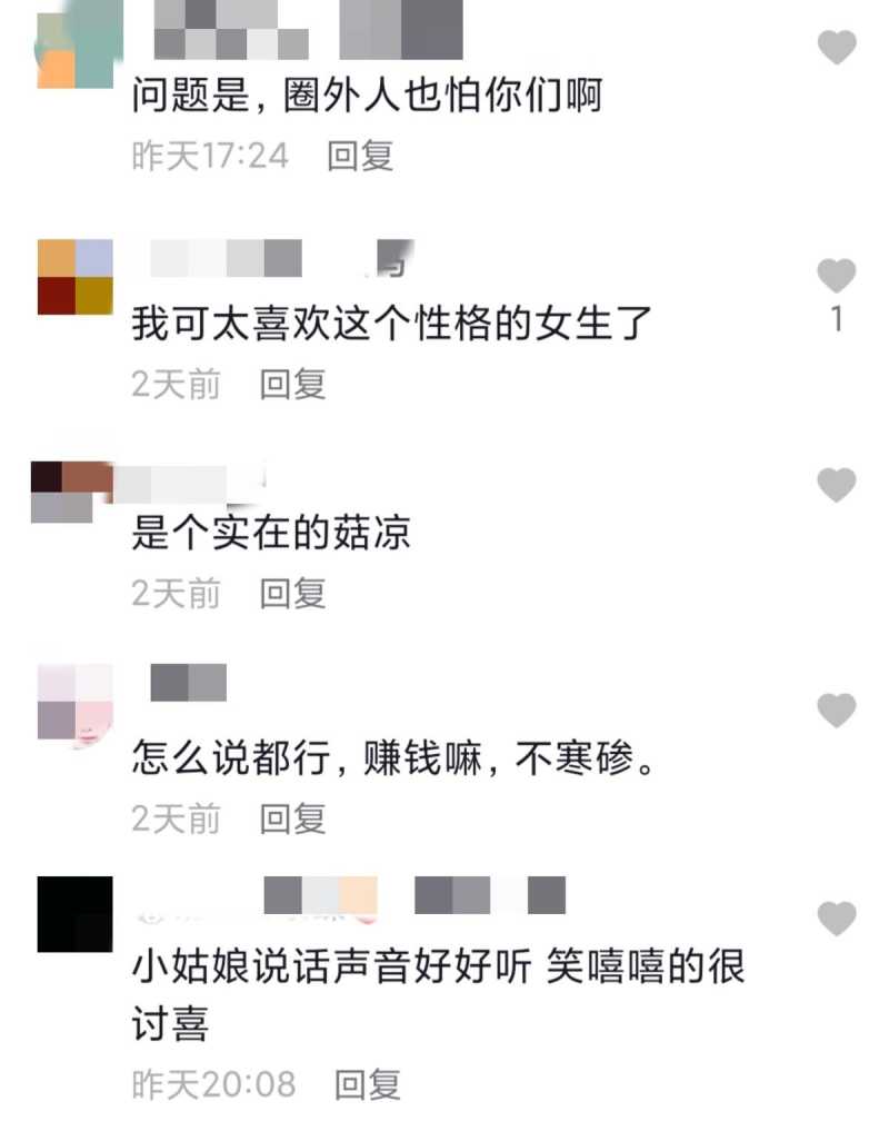 网友看了高晟瑶的采访,有人直言非常喜欢这样性格大方的姑娘,觉得她太实在了。还有网友觉得都只是为了赚钱而已,男生爱玩也可以理解。有一位网友表示能理解她不想找男演员的心,但问题是圈外的男生也怕她们这些在娱乐圈的女生。