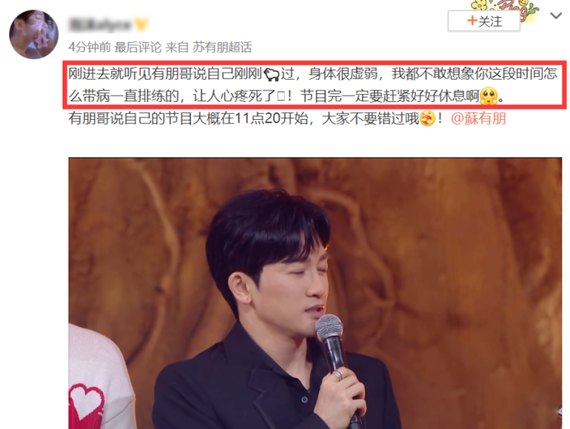 在采访中一旁的主持人问他上台会不会紧张,苏有朋也说出了自己的担忧,表示目前他整个人没什么力气,所以尽量让自己低能量的在台上撑过那几分钟,从苏有朋的话里能够听出来,他对自己的身体状况颇为担忧,唯恐自己坚持不下来,毕竟准备的两首歌都配备了舞蹈,运动量属实不小,这对目前体力不支的他来说肯定是不小的压力。