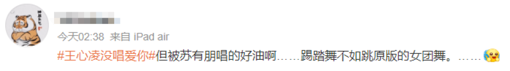 当晚苏有朋王心凌互唱对方成名曲《爱你》和《爱》,这种新的合作方式虽然引起了不少人回忆,但是广场上很多人认为苏有朋的声线不适合唱《爱你》这首歌,也有一些比较客观的网友表示这首作品改编得也不是很理想,而且可以看出苏有朋当晚的状态也不是很好。