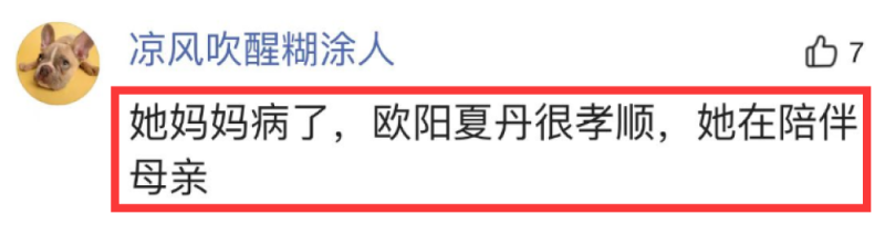 而有知情人士透露欧阳夏丹突然离开是因为自己选择回家去陪伴生病的母亲,此前的她一直因为工作繁忙,没能在父母身边尽孝,父亲在她18岁因癌症去世之后,她便下定决心不要让自己留下遗憾。