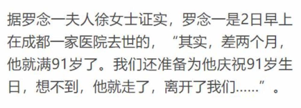 随后,罗念一的夫人证实了丈夫去世的消息,透露丈夫还有两个月就要迎来91岁,一家人还兴致勃勃地准备为其庆祝消息,孰能想到大家这个心愿已然无法实现忙。