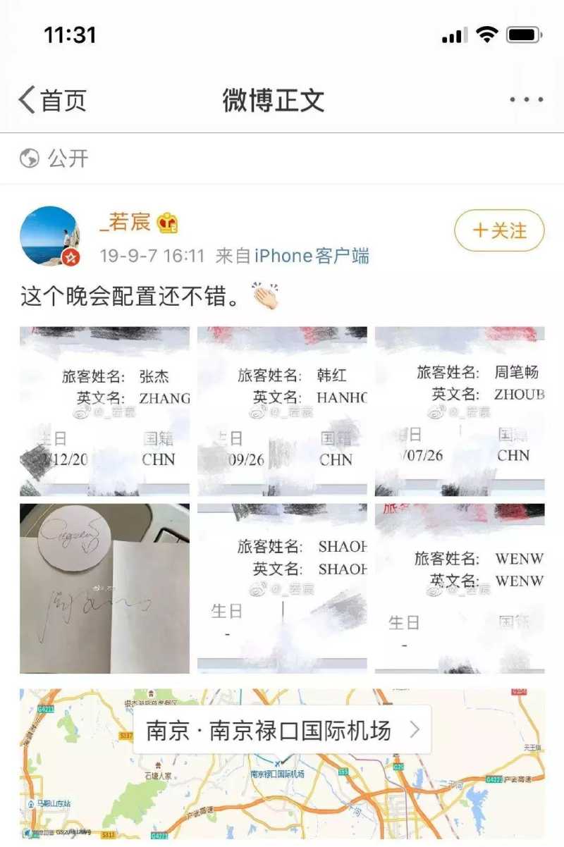 3日,知名航空博主、微博认证为“航空媒体人”的网友“超侧卫”发微博称,一名微博名为“_若宸”的微博网友在2019年9月7日发布了一条包含多张截图的微博,公布了包括张杰、韩红、周笔畅、张韶涵在内的乘坐航班的记录,并将相关乘机人的出生日期、座位号、常旅客状态等个人信息公开发布,微博发布地址显示为南京禄口机场。
