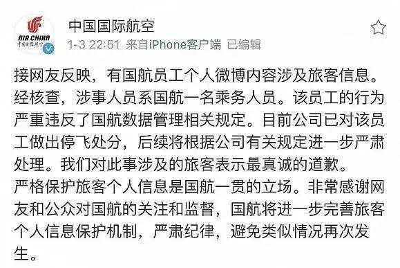 针对这一事件,中国国际航空公司官方微博3日深夜通报:针对网友反映有国航员工个人微博内容涉及旅客信息,国航对涉事乘务人员作出停飞处分。