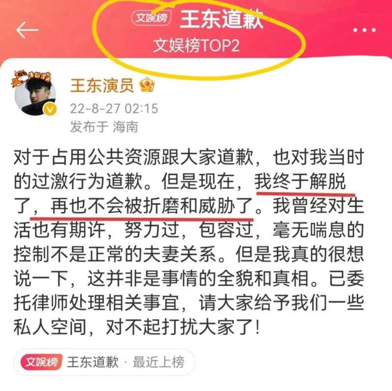 令人没想到的是,在王东的妻子爆料之后,王东在社交平台上发了一条看似道歉的声明,为什么说是“看似道歉”?