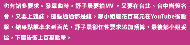 而且舒子晨之前发唱片,要求相当多,要拍mv,在台中台北办签名会,还要上杂志,个个都要钱,邹小姐还花了几十万帮她在社交平台上冲点击量,点击量没突破百万,舒子晨又任性追加预算,邹小姐无奈妥协,又帮她冲上百万点击量。