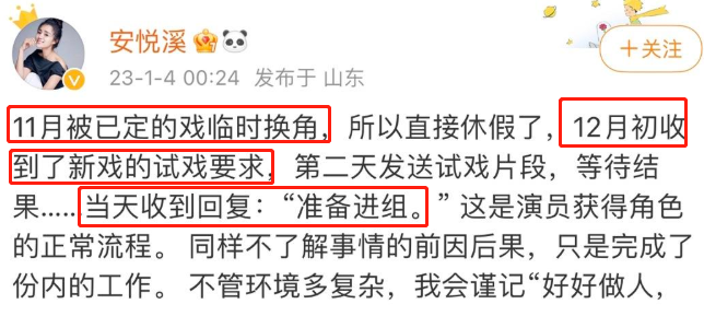 安悦溪的回应也很快,称自己11月正准备进组,结果角色被人顶替了,没想到12月接到《以爱为营》的试戏要求,就试上了王梓薇的角色,自己走的是正常流程。