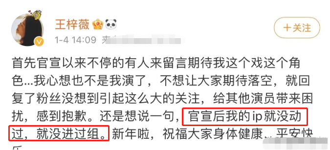 王梓薇也再次回应,称自己在剧方官宣后就没动过IP,暗指她压根没能进组,被换不是因为演技差或没档期。