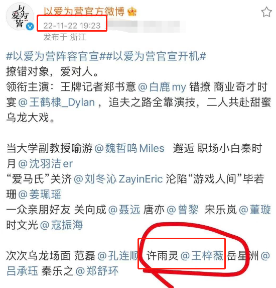 早在去年11月,电视剧《以爱为营》的官博就官宣了演员阵容,主演是白鹿、王鹤棣,王梓薇在其中演了个小配角。