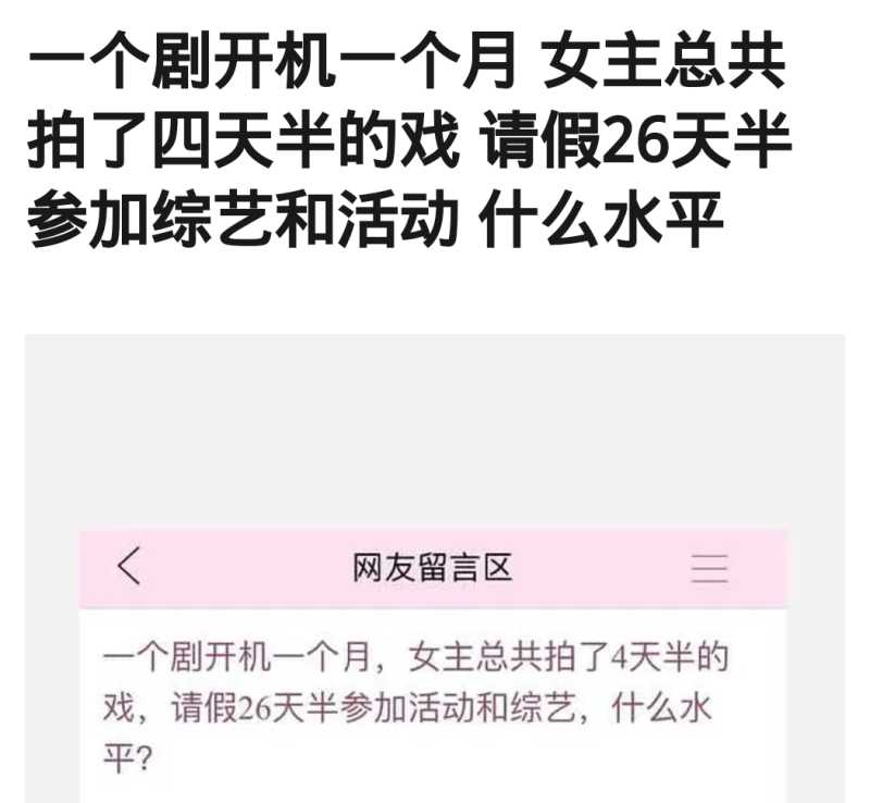 该帖子爆料的具体内容为该名女明星作为电视剧拍摄的女主演,在开机一个月的时间中,竟然总共只拍了四天半的戏,剩下的26天半则请假去参加了综艺和活动,爆料的网友还在帖子中询问到这是"什么水平"。
