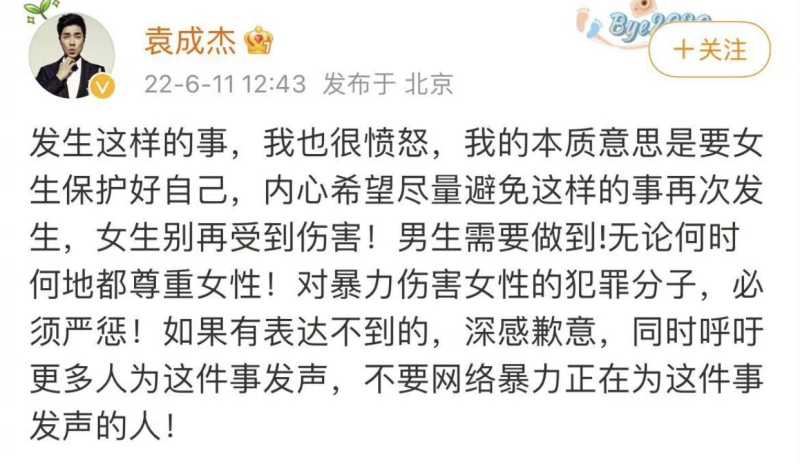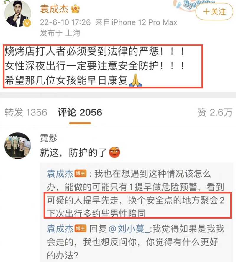 袁成杰发文劝女孩子们注意安全,出门时多带一些男性陪同。原本他的初衷是好的,却还是引起了争议。