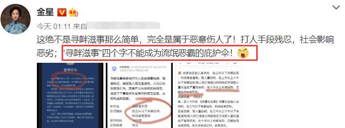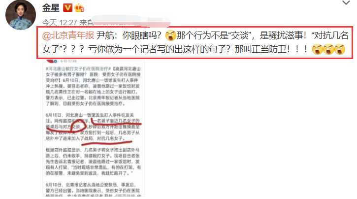 有网友留言称有官媒将此次事件描述成几名男子“对抗”女性。6月11日中午,金星找到原报道后,直接点名道姓地骂那位记者:“你眼瞎吗?”