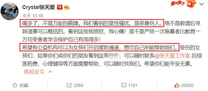 张天爱在谴责施暴者的同时,不忘关心受伤的女孩们。