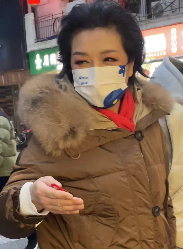 从网友晒出的照片,江珊身穿一件棕褐色羽绒服,搭配黑色靴子,戴着红色口罩匆匆疾走。