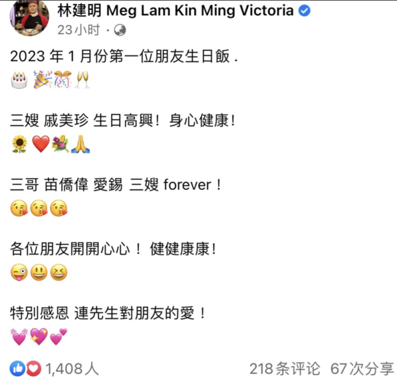 据悉,1月5日是戚美珍61岁的生日,苗侨伟回国为爱妻庆生,还特意叫上亲朋好友欢聚一堂。香港演员林建明也是生日宴的一员,还特意发动态感谢。