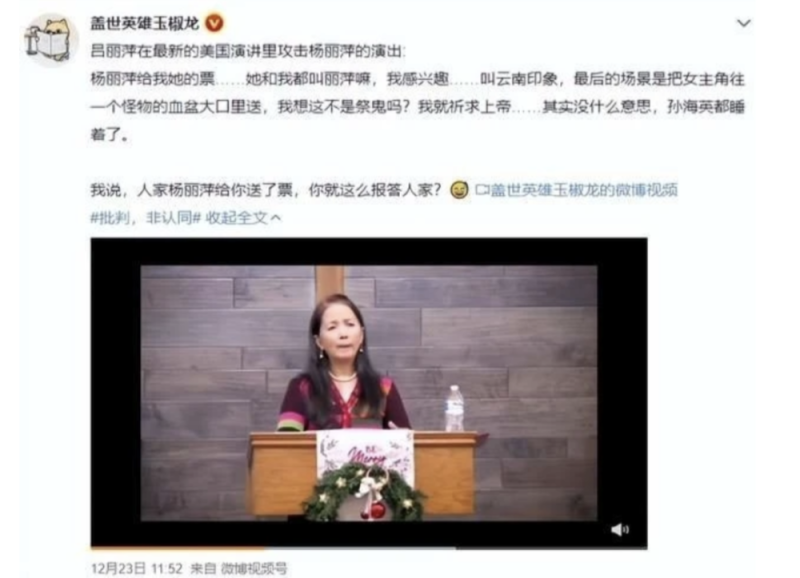 在这次的演讲中,吕丽萍吐槽杨丽萍的舞蹈《云南印象》,称看《云南印象》是一种折磨,孙海英看得都睡着了。