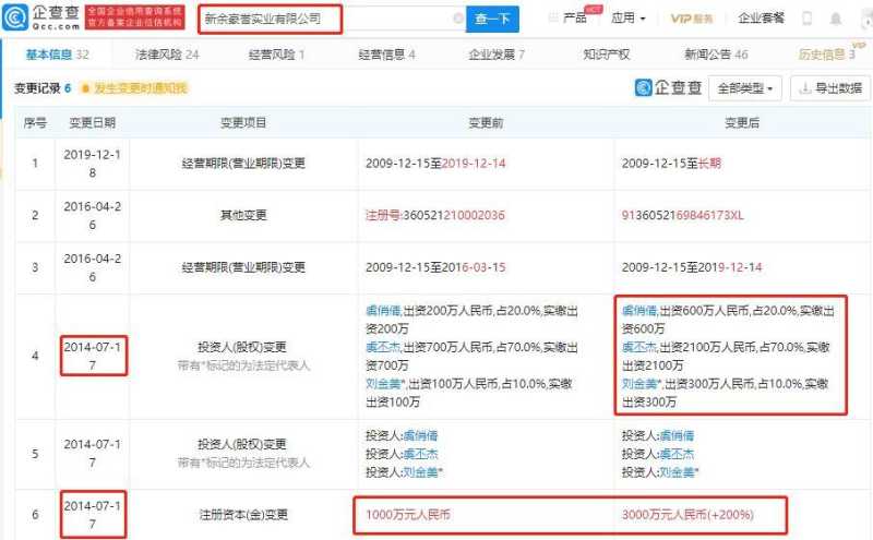 2013年拿不出200万的虞书欣父母,在2014年增加注册资本并进行了实缴: