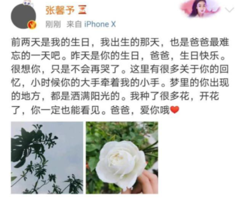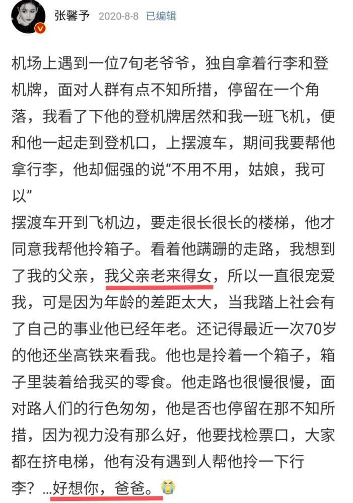 张馨予之前参加综艺节目时也曾公开提到父亲,表示父亲是老来得女,所以从小就将她捧在手心疼爱,父亲的去世对张馨予的打击很大,那段时间她的状态也一直不太好,后来才知道原来她的父亲走了。