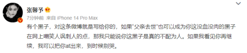 在动态中张馨予还愤怒表示,如果“父亲去世”也可以成为你这没血没肉的黑子在网上嘲笑人讽刺人的点,那只能说你这黑子不配为人,也难怪张馨予如此生气,家人是她的底线,她不允许任何人利用她的家人攻击她。