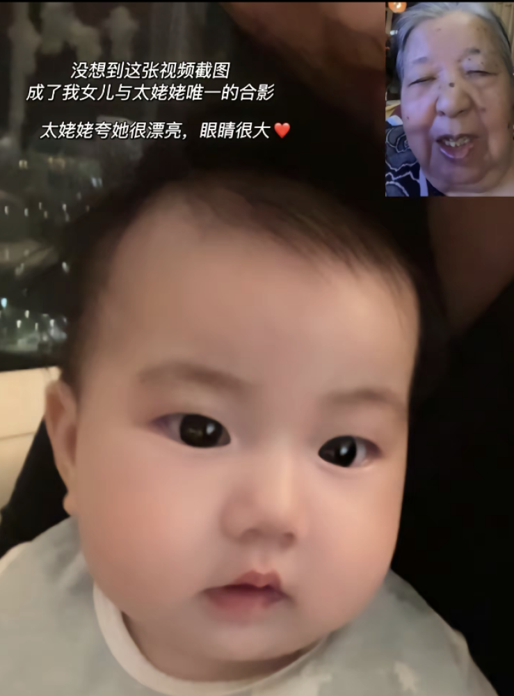 张嘉芸还晒出女儿与姥姥视频的画面,没想到这张视频截图成了孩子与太姥姥唯一的合影,太姥姥还夸孩子很漂亮,眼睛很大。
