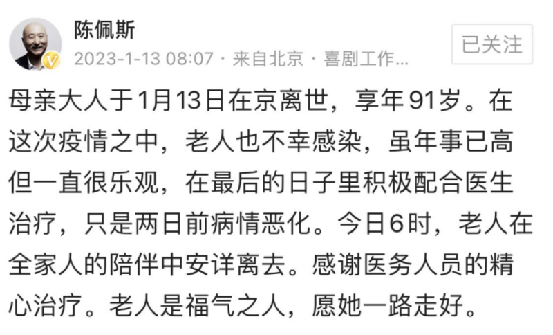 1月13日一早,陈佩斯发文透露自己母亲因为感染新冠不幸离世,终年91岁。
