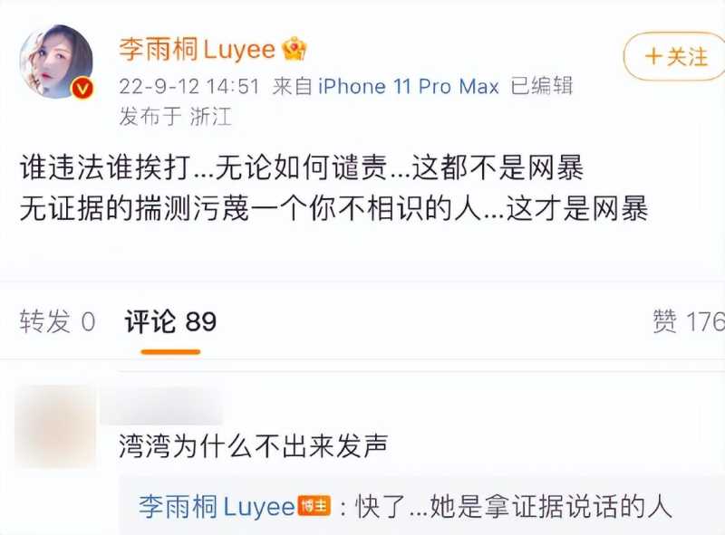 这个重磅爆料一出,很快引起外界网友的热议与讨论,不少网友坚持认为湾湾有借机炒作自己之嫌,眼看着湾湾成为舆论热议的对象,薛之谦的前任李雨桐主动发声力挺好友,其中提到“无证据的揣测污蔑一个你不相识的人,这才是网暴”。在评论区,李雨桐还表示当下湾湾正在搜集与整理相关证据,还透露湾湾是一个拿证据说话的人。