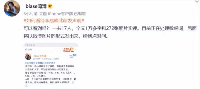 在9月12日,疑似湾湾的小号发布了一条动态,透露在过去的十几个小时里受到了威胁,将自己所知道的告知大家,除了李易峰外,还有“L姓”“W姓”“C姓”“H姓”“Z姓”“X姓”艺人,其中W姓、Q姓富二代都曾犯过和李易峰一样的错误,另外全文一万多字,还包括了270张照片实锤,其中牵扯到17位文娱圈人士。