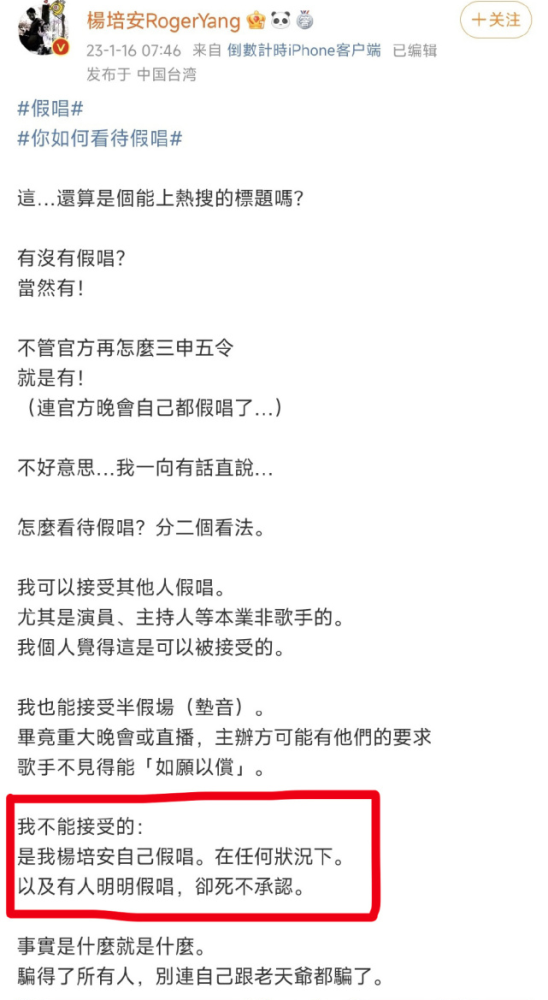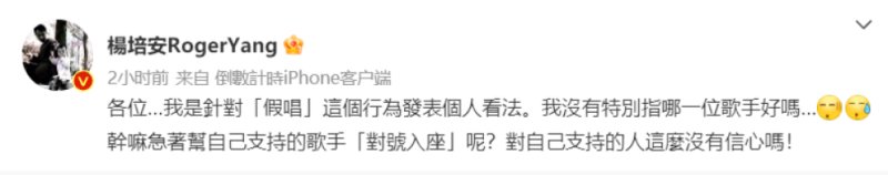 眼看着这件事引发的舆论愈演愈烈,16日一早,歌手杨培安发布动态表抒发自己的感想,语气激愤地痛斥“假唱”这种不专业的行为,其中杨培安还表示自己不能接受有的人明明在假唱,却死不承认,言辞也是相当之犀利。