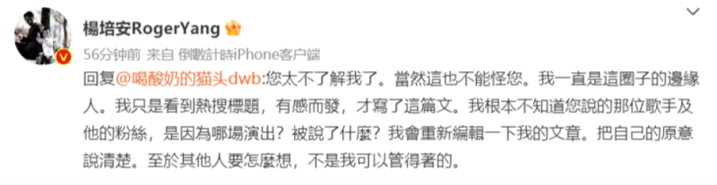 然而杨培安的解释依旧受到了部分网友的围攻,有些网友认为杨培安是在责怪某些明星的粉丝,这样的操作实在有失体面,在与评论区网友对线的过程中,杨培安再度重申自己发表的这篇感想并没有特别指向性,而是因为自己作为歌手对“假唱”这个话题有感而发,没想到却触怒了部分粉丝,对此杨培安也表示每个人都有言论自由,至于其他人说什么,自己也无法约束与制止。