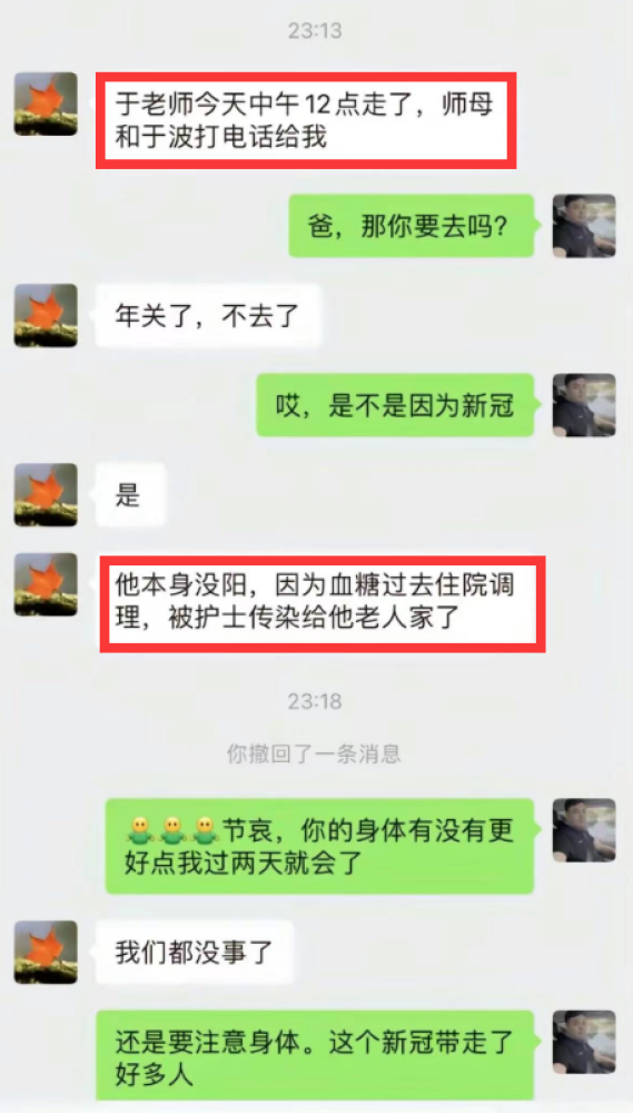 于海的一位后辈友人也晒出聊天记录,透露于海生前因为血糖问题住院进行调理,入院之际的他并未感染病毒,没想到在住院过程中不幸被护士传染。