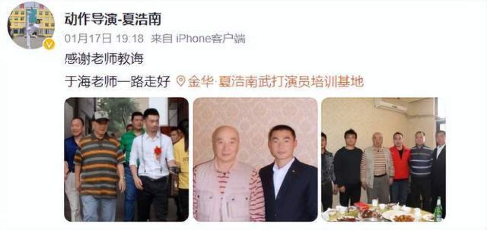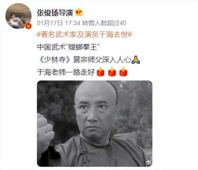 演员吴樾、张俊扬导演、动作导演夏浩南、制片人杨启明等也纷纷发文送别于海老师,回忆过往合作的点滴都历历在目。