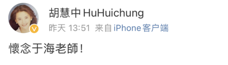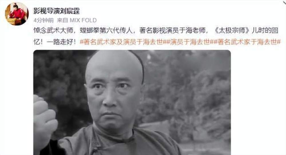 演员胡慧中连发两条动态送别于海老师:“惊闻噩耗传,先生驾鹤去,著名武术家、演员,螳螂拳大师于海先生,一路走好”。