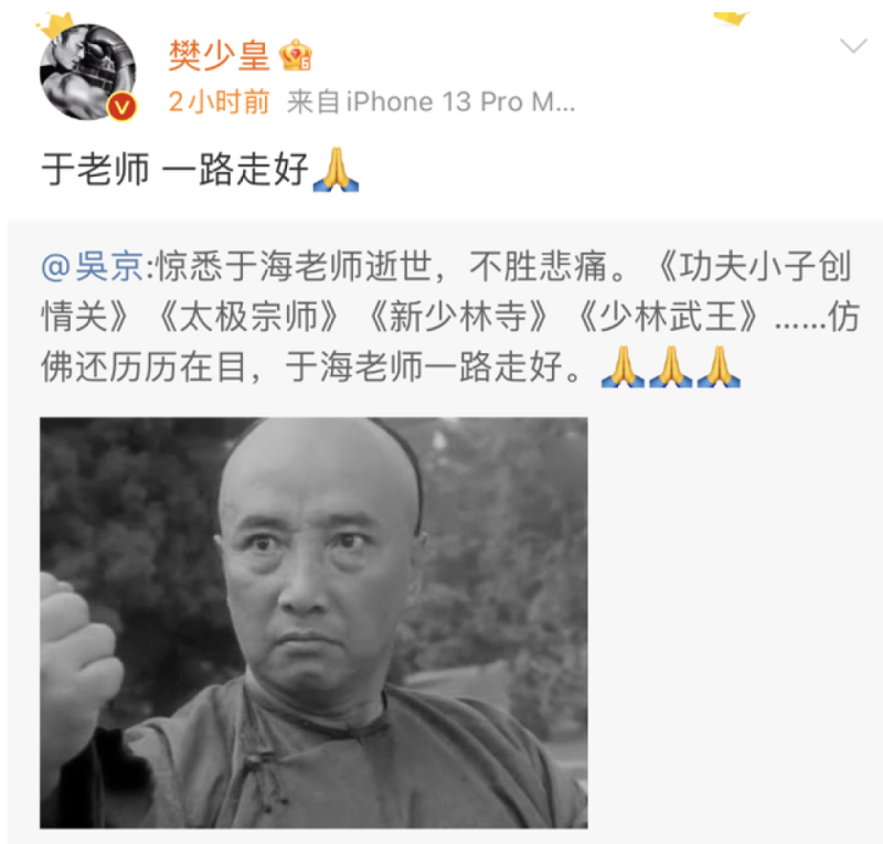 1月18日凌晨4点多,演员樊少皇转发吴京的动态送别于老师,他写下“于老师,一路走好,”
