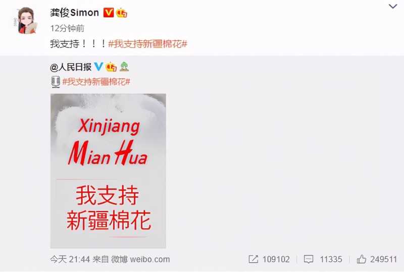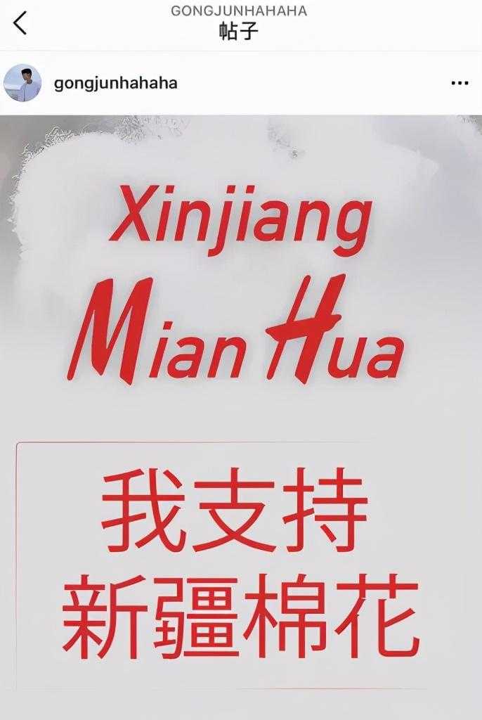 不少爱国艺人也纷纷发声。最近凭借《山河令》走红的演员龚俊在微博上转发了人民日报的“我支持新疆棉花”,在INS上也发了支持新疆棉花,好感度拉满。