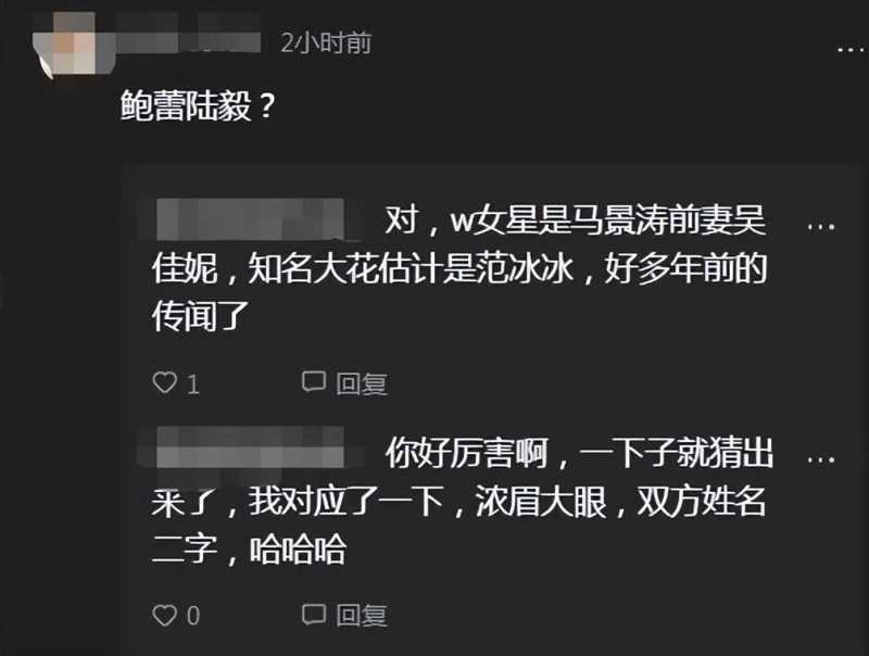 这一线索更加清晰了,根据名字上打码的长度来判断,这个一线大花和w姓女星是三字。有知情网友表示大花是范冰冰,女星是马景涛前妻吴佳妮。