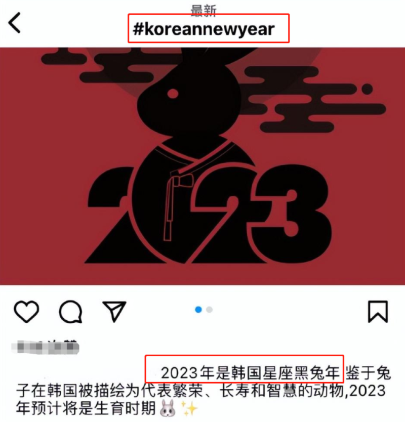 韩国网友在外网发文,称2023年是韩国星座黑兔年,还将英文中“春节”的传统写法“ Chinese New Year(中国新年)”,改成了“Korean New Year(韩国新年)”。