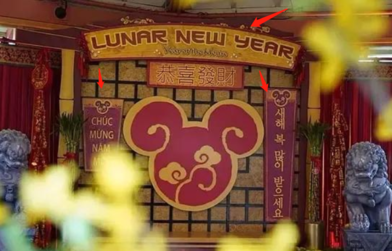 而后果就是,迪士尼发布新年庆祝视频,只用中文写了个恭喜发财,春联上写的是韩文和越南语,连横批上都是英文版的“农历新年”,绝口不提中国。