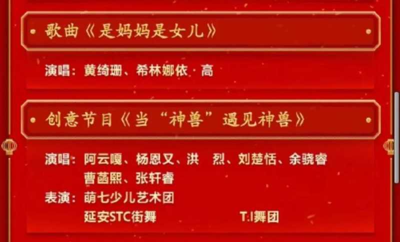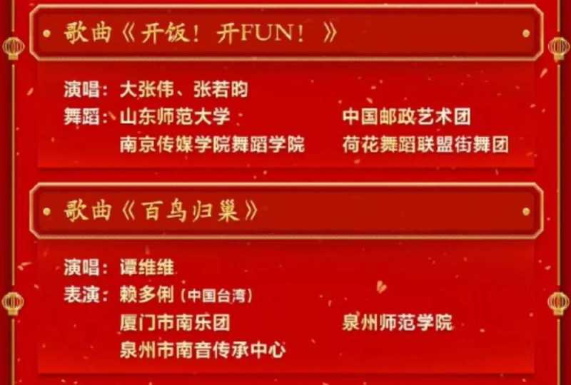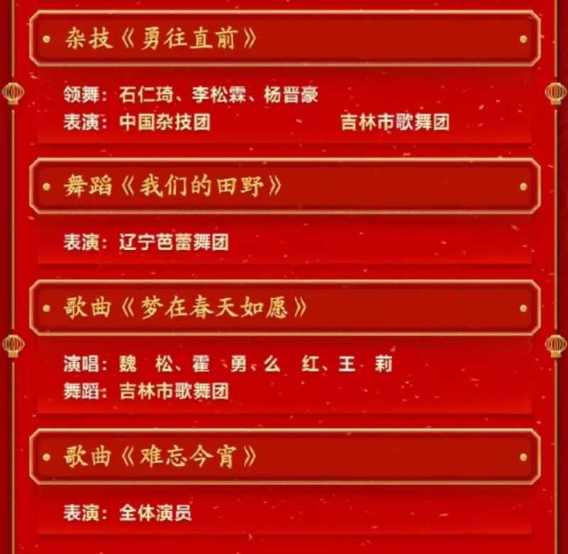 此外,还有一个相声、一个脱口秀、一个戏曲、两个杂技、三个舞蹈以及其他创意节目,除去三个公益广告,加上开场,所有的节目加起来,共有41个。