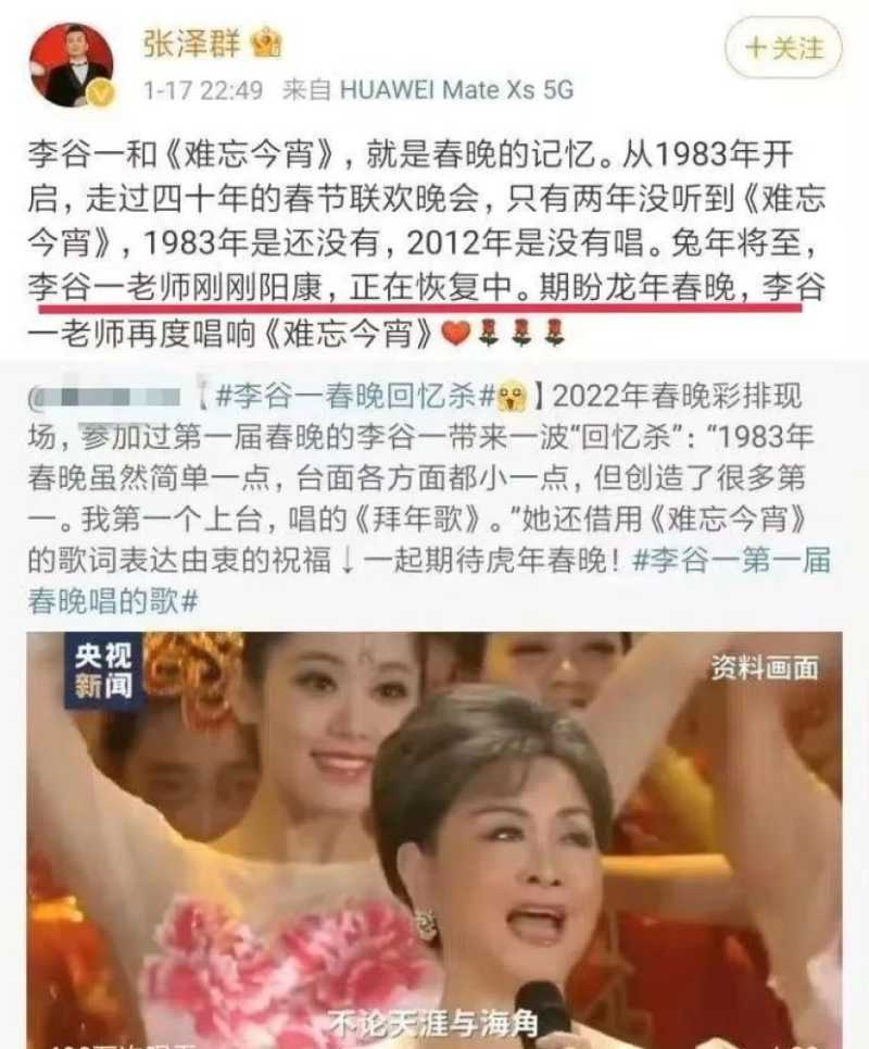 关于李谷一缺席春晚的原因,主持人张泽群透露是受身体状况的影响,她刚刚阳康,不管怎么说,身体健康最重要,希望李谷一老师早点康复。