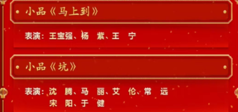 除了歌曲以外,舞蹈、小品、相声、杂技、微电影应有尽有。根据统计,本次春晚一共有5个小品,分别是《初见照相馆》《马上到》《坑》《上热搜了》《对视50秒》。
